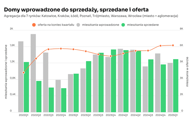 Choć r/r obserwujemy spadki w wynikach sprzedażowych deweloperów, w porównaniu kw./kw. sprzedaż wzrosła w 4 z 7 wspomnianych regionów. Warszawa i aglomeracja odnotowała 27% wzrost sprzedaży między kwartałami. W Katowicach i okolicy sprzedaż wzrosła o 19%, a we Wrocławiu i aglomeracji o 11%. W Poznaniu i okolicach deweloperzy sprzedali o 10% więcej domów niż w ostatnim kwartale 2024 r. Aktualnie oferta na tym rynku jest najniższa od kwietnia 2022 r. Brak nowych projektów deweloperskich w tym obszarze może skutkować ograniczeniem dostępności oferty w kolejnych kwartałach. W Łodzi i aglomeracji sprzedaż była podobna do tej z ubiegłego kwartału, w Trójmieście i okolicy spadła o 6%, a w Krakowie wraz z aglomeracją o 15%.