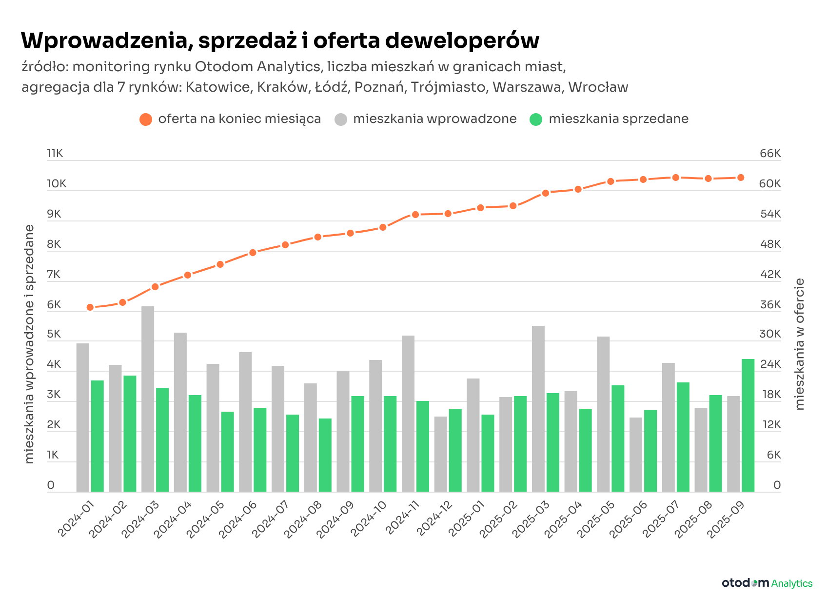 Wyższa względem poprzedniego miesiąca była także liczba mieszkań wprowadzonych do sprzedaży, jednak skala wzrostu bieżącej podaży (wprowadzeń) miesiąc do miesiąca była wyraźnie mniejsza niż w przypadku sprzedaży i wyniosła 14%. To oznacza, że na siedmiu największych rynkach we wrześniu firmy deweloperskie rozpoczęły sprzedaż 3,2 tys. mieszkań w 103 nowych inwestycjach/etapach.