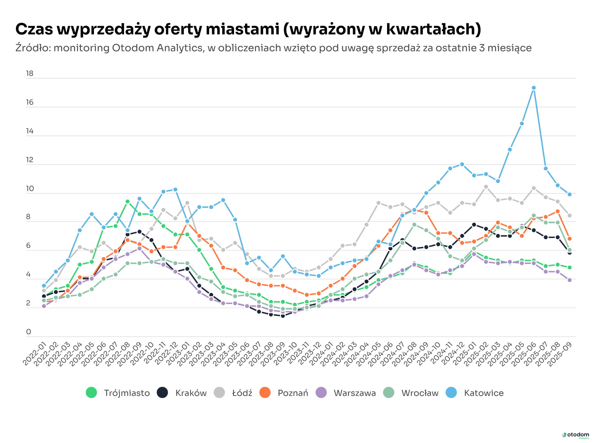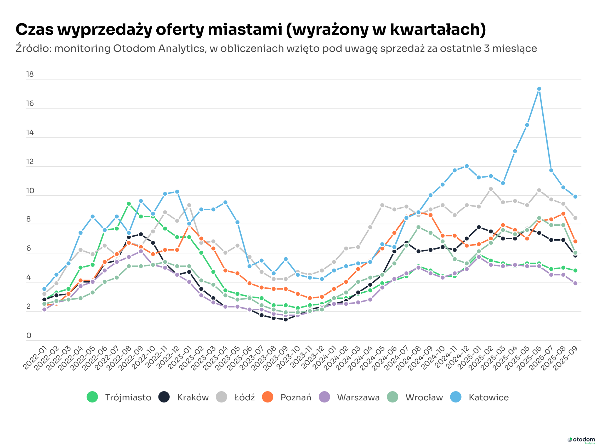 Największa redukcja wskaźnika czasu wyprzedaży oferty nastąpiła na rynkach poznańskim i wrocławskim, gdzie we wrześniu odnotowano dobrą sprzedaż, a w przypadku rynku wrocławskiego także niewielki spadek oferty. Na wszystkich rynkach głównym źródłem skrócenia się czasu wyprzedaży oferty były wyraźnie lepszy niż trzy miesiące temu wynik sprzedaży. W efekcie wynik suma mieszkań sprzedanych z trzech ostatnich miesięcy okazała się znacznie wyższa niż miesiąc temu.