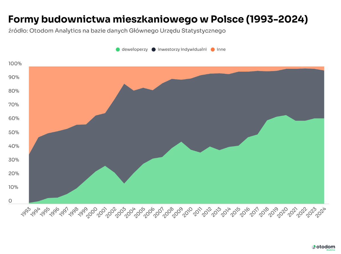 Deweloperzy odpowiadają obecnie za ponad 60% produkcji mieszkaniowej, reszta to głównie inwestorzy indywidualni, czyli osoby budujące dom na własne potrzeby. Pozostałe formy budownictwa - spółdzielcze, komunalne, społeczne czynszowe i zakładowe - od lat stanowią mały procent. Aktualna proporcja pomiędzy deweloperami a inwestorami indywidualnymi utrzymuje się od 2018 r. Wcześniej systematycznie rosła. 10 lat temu mieszkania deweloperskie stanowiły ok. 40% nowych lokali, 20 lat temu było to ok. 20%, a 30 lat temu deweloperzy stawiali w Polsce pierwsze kroki.